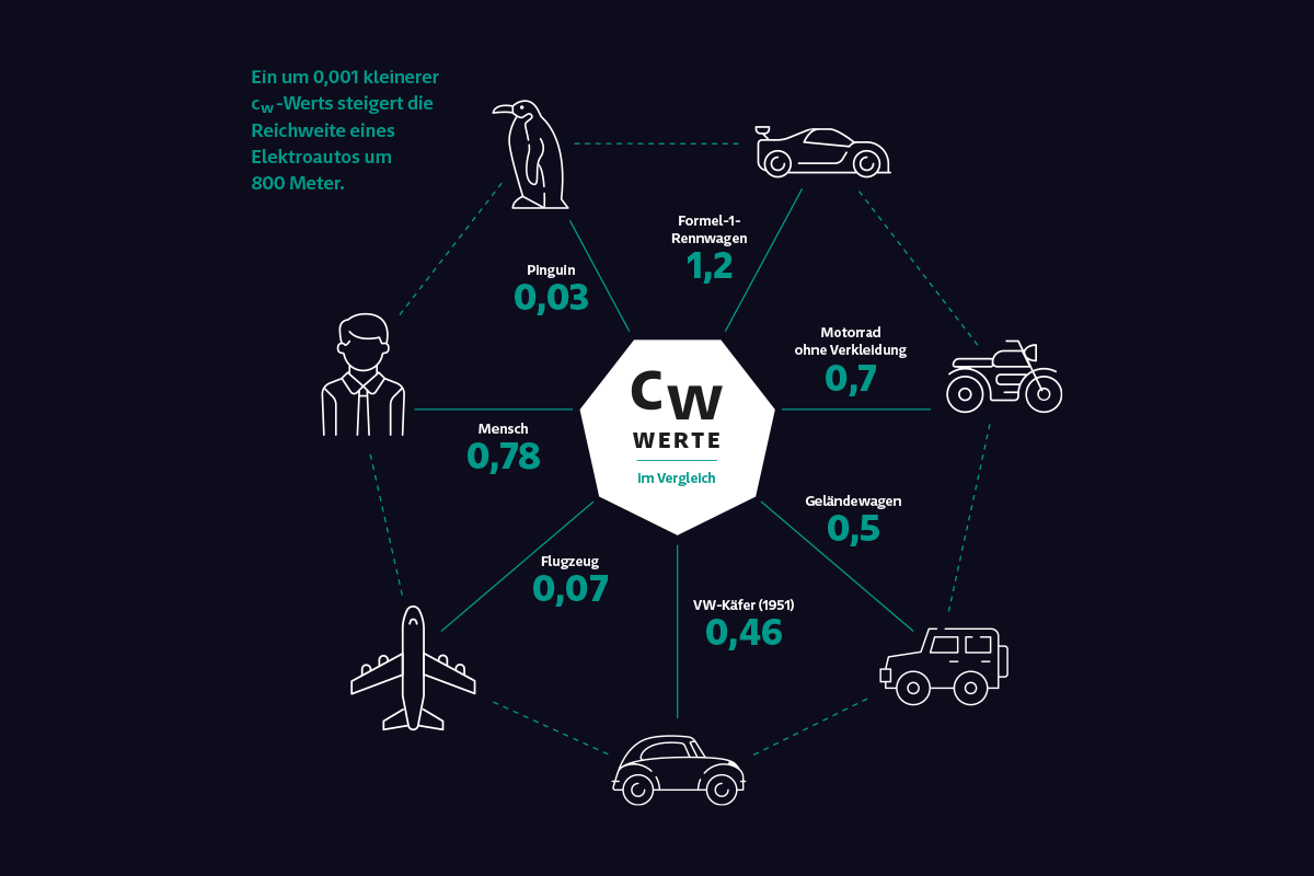 Reichweite ist eine der wichtigsten Kennzahlen von Elektroautomobilen. Anders als bei Fahrzeugen mit Verbrennungsmotor wirkt sich der Luftwiderstand eines E-Autos viel unmittelbarer auf seine Reichweite aus als beispielsweise das Gewicht: Jedes Tausendstel, das ein Hersteller am cw-Wert – das Maß für den Strömungswiderstand eines
