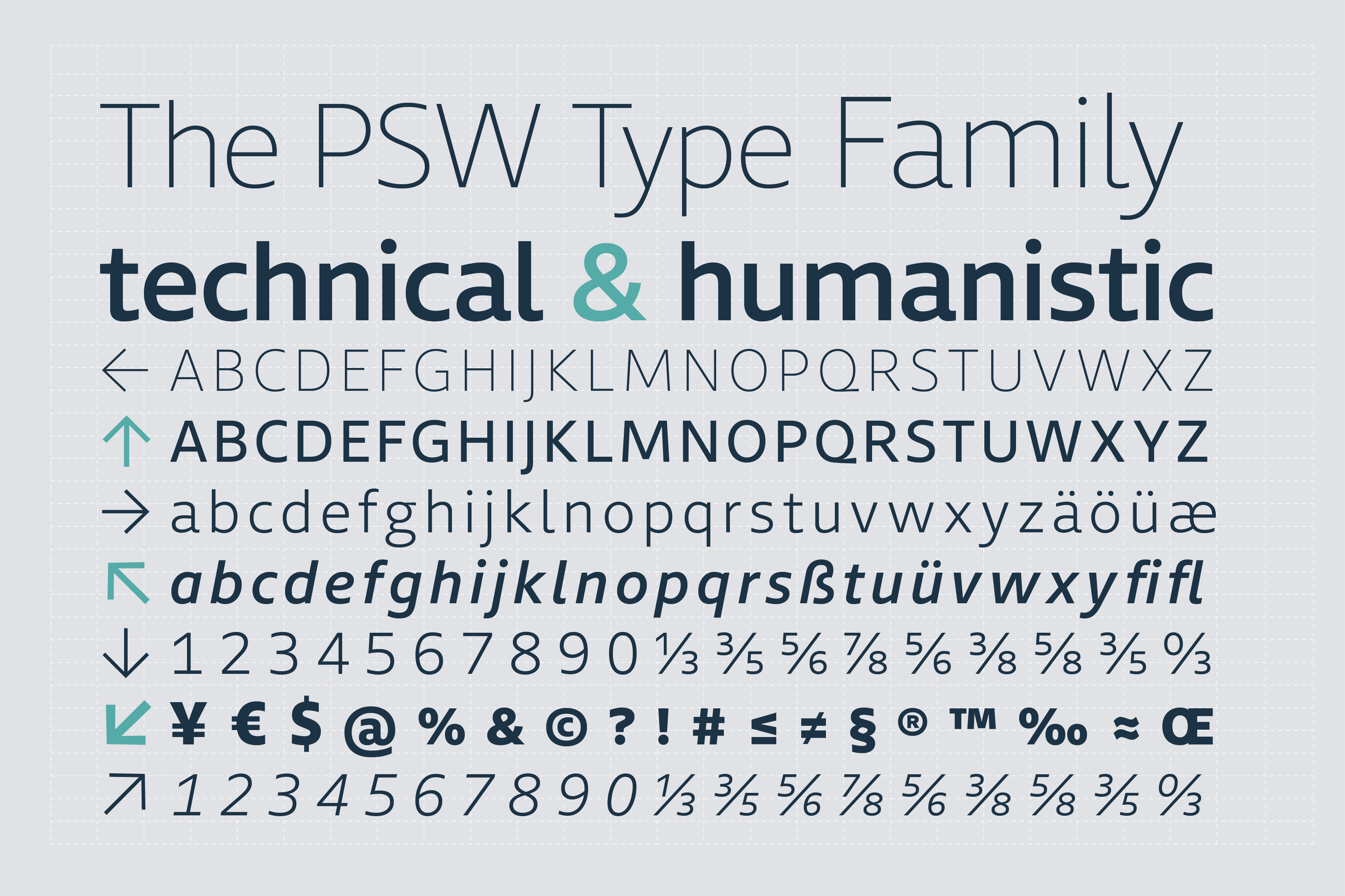 Das Schriftbild der PSW Type ist aufgrund der kontrast- armen Strichstärke klar, modern und zeitlos. Diese Eigenschaft macht sie so universell einsetzbar – von der Geschäftsausstattung über die digitalen Medien bis hin zur Kennzeichnung in unseren Gebäuden. Ihre Buchstaben wirken im Detail humanistisch und technisch konstruiert. Die PSW Type ist speziell auf unsere Bedürfnisse in der Office-, Print- und Digitalkommunikation angepasst.